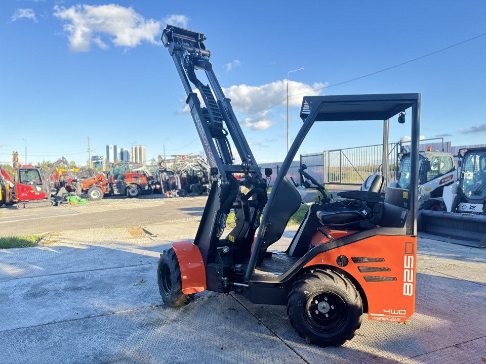CASTLOADERS 825D был специально разработан для использования в ограниченном пространстве - сиденье водителя расположено сзади, а подъемная мачта на передней части поворотной рамы. Благодаря этому части рамы не выступают за габариты колеи движения погрузчика. Благодаря этому данный погрузчик популярен в небольших фермерских хозяйствах.
