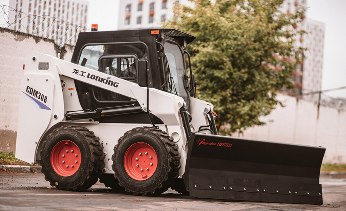 Поворотный отвал IMPULSE TB2000 - навесное оборудование для фронтальных мини-погрузчиков Bobcat, JCB, Komatsu и других брендов. Оборудование используется коммунальными службами для очистки снега с дорог, парков и других территорий.